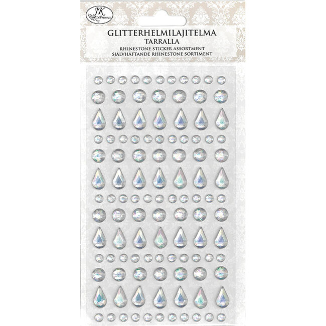 Glitterhelmitarralajitelma askarteluun ja koristeluun. Pakkaus sisältää yhden arkin muovisia glitterhelmitarroja useassa eri koossa.