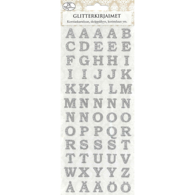 Glitterkirjaimet tarralla askarteluun ja koristeluun. Tarran pinta kokonaan glitteriä, jossa koristeena kirkkaita tarrahelmiä.