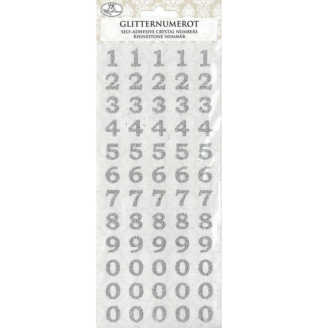 Glitternumerotarrat askarteluun ja koristeluun. Tarran pinta kokonaan glitteriä, jossa koristeena kirkkaita tarrahelmiä.