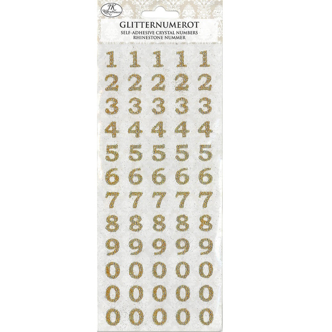 Glitternumerotarrat askarteluun ja koristeluun. Tarran pinta kokonaan glitteriä, jossa koristeena kirkkaita tarrahelmiä.