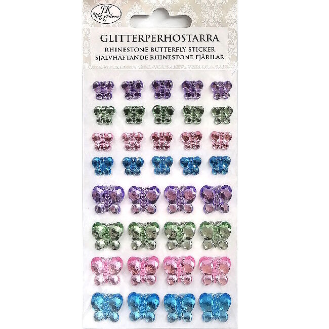 Pakkauksessa lajitelma glitterperhostarroja, 2 eri kokoa/4 eri väriä.