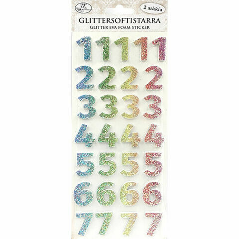 Glittersoftistarrat askarteluun ja koristeluun. Pakkaus sisältää kaksi arkkia vaahtomuovisia softisnumeroita, joissa on glitterpinta.