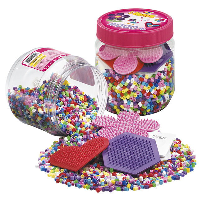 Purkki sisältää noin 4000 helmeä, 3 pientä alustaa – kuusikulmainen, sydän, kukka – mallikuvia, ohjeet ja silityspaperia. Ikäsuositus 5+.