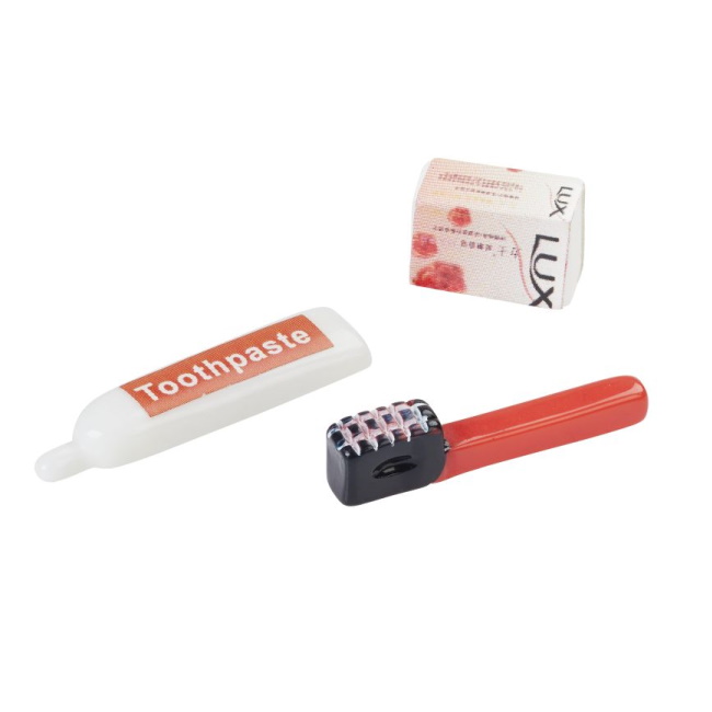Miniatyyri hammasharja ja -tahna, noin 2 cm.