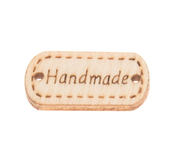 2,4 x 1,2 cm. Puinen ovaalinmuotoinen nappi, tekstillä Handmade, reiät reunoissa kiinnitystä varten. Koivua.