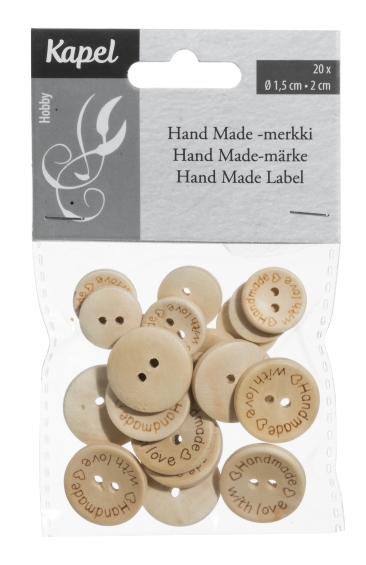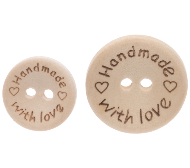 1,5 cm tai 2 cm. Puinen pyöreä nappi, 2 eri kokoa/pss, teksti Handmade with love, reiítetty. Koivua.