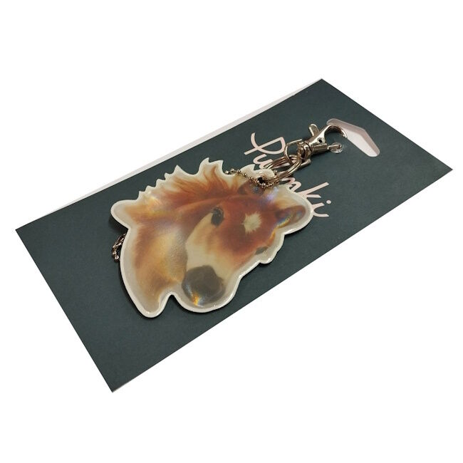Suomalainen design heijastin hevosen kuvalla. Sisältää papukaijalukon ja palloketjun. Heijastin on CE (EN 13356)-merkitty. Tyyppitarkistettu, heijastin täyttää EU:n henkilönsuojainasetuksen 2016/425. Sisältää pieniä osia, ei sovellu alle 3-vuotiaille. Koko: 6 x 8 cm. Palloketju: 7 cm. Design: Henna Adel. Valmistettu Suomessa.