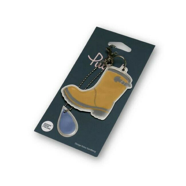 Suomalainen design heijastin keltaisen kumisaappaan kuvalla. Sisältää papukaijalukon ja palloketjun. Heijastin on CE (EN 13356)-merkitty. Tyyppitarkistettu, heijastin täyttää EU:n henkilönsuojainasetuksen 2016/425. Sisältää pieniä osia, ei sovellu alle 3-vuotiaille. Koko n. : 7,5 x 10 cm. Palloketju: 7 cm. Design: Kaisu Sandberg. Valmistettu Suomessa.