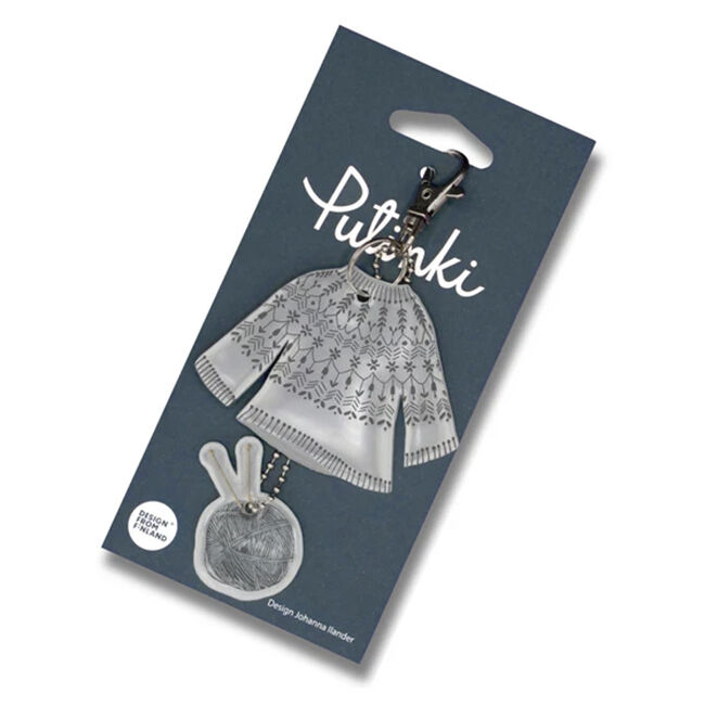 Suomalainen design heijastin, aiheena kirjoneule ja lankakerä. Sisältää papukaijalukon ja palloketjun. Heijastin on CE (EN 13356)-merkitty. Tyyppitarkistettu, heijastin täyttää EU:n henkilönsuojainasetuksen 2016/425.