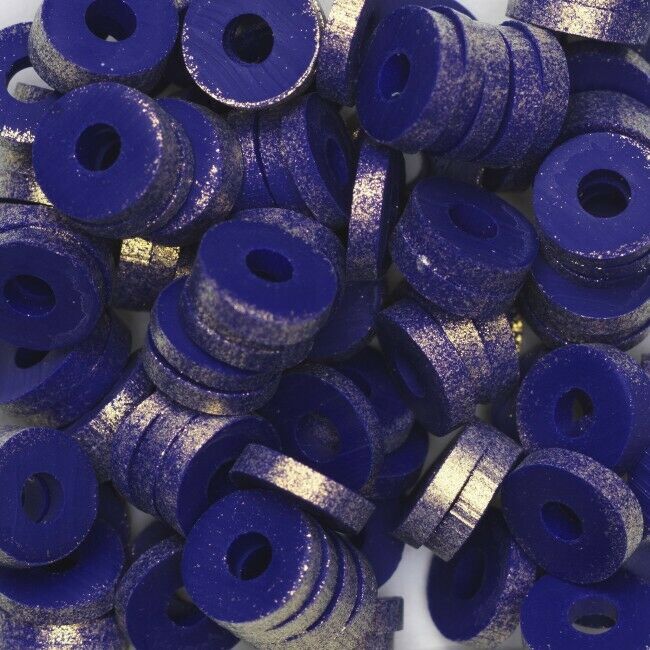 Litteät heishihelmet. Helmet on valmistettu polymeeripohjaisesta savesta, joka tuntuu kovalta kumilta ja jossa on joustavuutta.