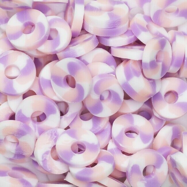 Litteät heishihelmet. Helmet on valmistettu polymeeripohjaisesta savesta, joka tuntuu kovalta kumilta ja jossa on joustavuutta.