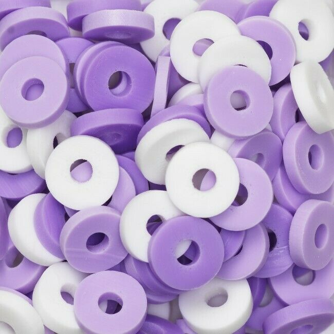 Litteät heishihelmet. Helmet on valmistettu polymeeripohjaisesta savesta, joka tuntuu kovalta kumilta ja jossa on joustavuutta.