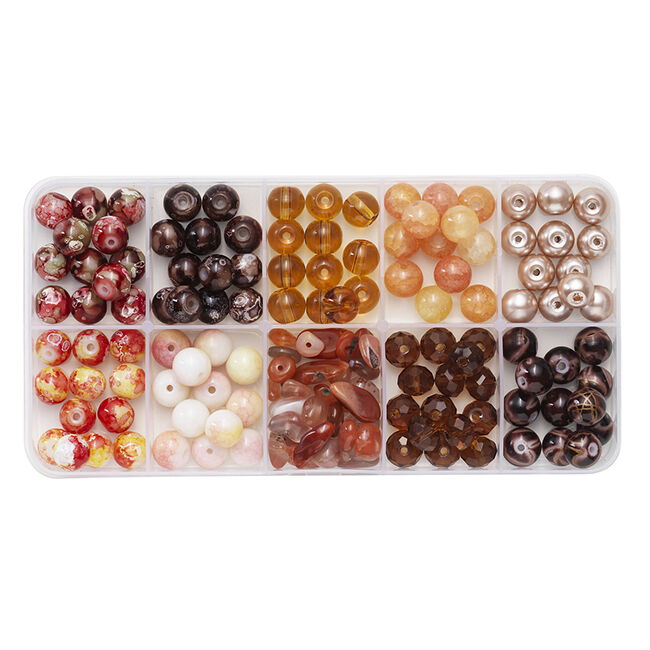 Pakkauksen 12 lokerosta kahdeksassa on pyöreitä ja sileitä Ø8 mm lasihelmiä klassisissa kivi-, marmori-, meripihka- ja tumman helmen väreissä. Yhdessä lokerossa on hieman litteitä meripihkamaisia ja epäsymmetrisiä helmiä, joiden väri vaihtelee kauniisti. Viimeisessä lokerossa on fasettihiottuja tummanpunaisia Ø6–7 mm helmiä, jotka kimaltelevat kauniisti valossa. Kaikissa helmissä on 1 mm reiän halkaisija.