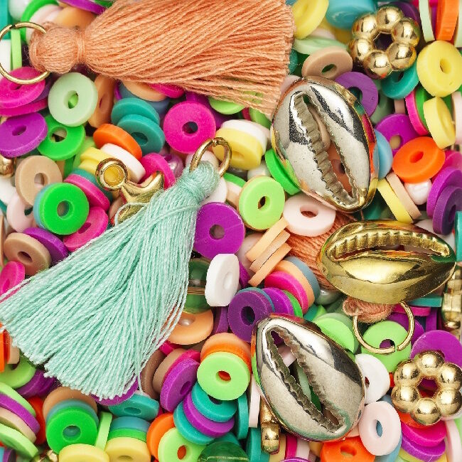 Helmimix – Heishi helmiä, sekä paljon hauskoja riipuksia, tupsuja, pyöreitä helmiä ja vähän muuta. Tämä pakkaus on todella villi sekoitus niille, jotka haluavat sekoittaa ja haluavat jotain villiä ja eloisaa! Heishi-helmien mitat: halkaisija 6 mm, paksuus 2 mm - reiän halkaisija 1,8 mm. Heishi-helmet on valmistettu polymeeripohjaisesta savesta. Muut esineet ovat muovia, lukuun ottamatta tupsuja, jotka on valmistettu akryylistä. Huomaa, että korulanka ei sisälly pakkaukseen.