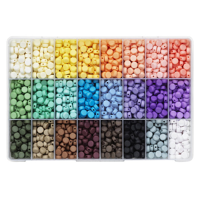 Huimat 2400 kaunista pyöreää ja litteää pastellisävyistä helmeä 24 eri värissä! Helmien muoto muistuttaa klassisia kirjainhelmiä, mutta tässä ei ole kirjaimia – vain mattapintaisia helmiä iloisissa väreissä!