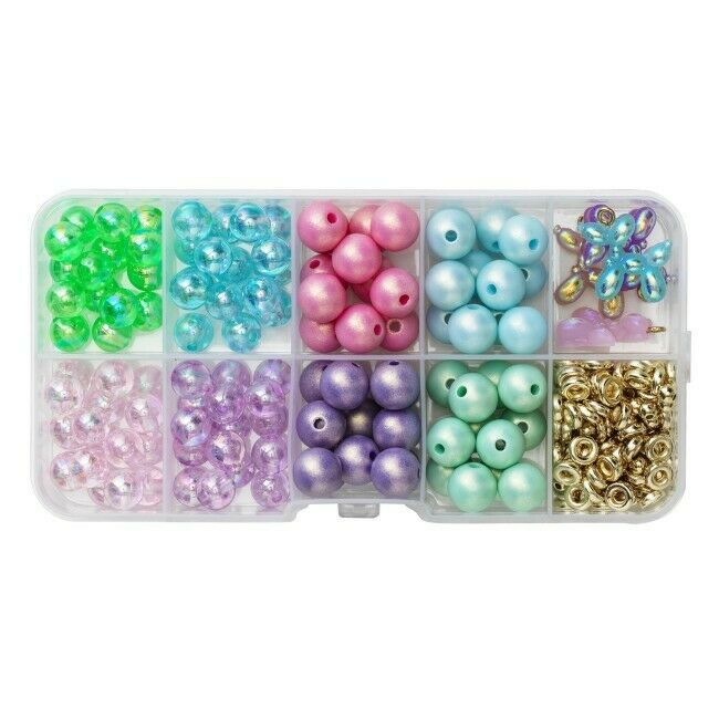 Tässä on helmisekoitus, joka tekee sinut todella onnelliseksi. Neljä osastoa on täytetty pyöreillä puoliläpinäkyvillä ja värikkäillä helmillä, joiden halkaisija on 8 mm – ja 4 lokeroista on täytetty pastelli- ja helmiäishelmillä, joiden halkaisija on 10 mm. Yhteensä noin 110 helmeä. Sitten tulevat pakkauksen hienot riipukset irisoivien ilmapallokoirien muodossa, jotka vaihtavat kauniisti väriä. Riipukset ovat kooltaan 20×15 mm ja niissä on metallilenkki. Viimeinen lokero on täytetty 120 kultaisella muovisella välihelmellä kahdessa eri versiossa. Kaikkien helmien ja väliosien reiän halkaisija on 1 mm.