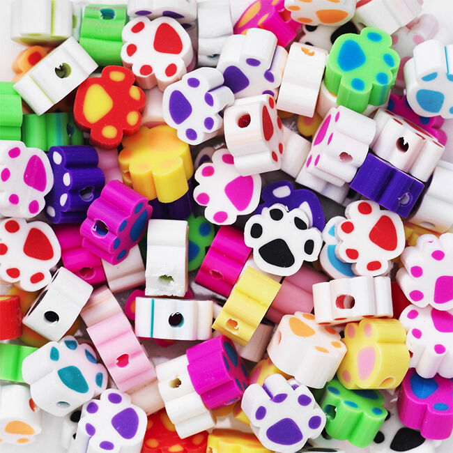 Polymeerimassasta tehdyt tassuhelmet, noin 100 todella hienoa, hauskaa ja värikästä tassunmuotoista helmeä, jotka todella nostavat rannekorun tai kaulakorun ilmettä. Kissan, ilveksen tai puuman tassunjäljet? Emme tiedä! Helmet ovat halkaisijaltaan noin 9 mm, paksuudeltaan 5 mm ja reiän halkaisija on 1 mm.