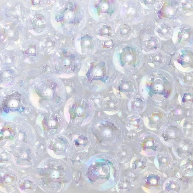 125 grammaa pyöreitä ja läpinäkyviä hohtavia/väriä vaihtavia akryylihelmiä, jotka näyttävät kauniilta saippuakuplilta - ja heijastavat myös valoa samalla miellyttävällä tavalla. Pakkauksessa on helmiä neljässä eri koossa - Ø 6, 8, 10 ja 12 mm, reiän halkaisija 2,2 mm.
