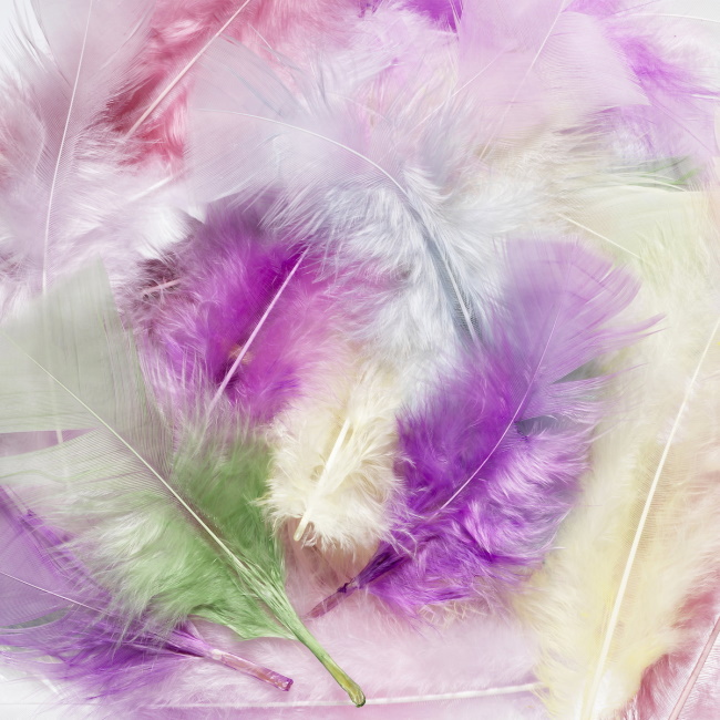 Jumbopakkaus pastellinvärisiä höyheniä. Noin 200 kpl.