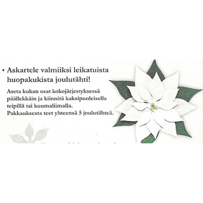 Huopakukat askarteluun ja koristeluun. Askartele valmiiksi leikatuista huopakukista joulutähti! Aseta kukan osat kokojärjestyksessä päällekkäin ja kiinnitä kaksipuoleisella teipillä tai kuumaliimalla. Viimeistele joulutähden keskiosa koristehelmillä. Pakkauksesta saat askarreltua viisi kolmiulotteista joulutähteä. Pakkaus sisältää 15 kappaletta valmiiksi leikattuja huopakukkia sekä viisi kappaletta muovisia kolmen helmen koristehelmisettejä. Kukat ovat kooltaan 5,5cm, 7,5cm, 9,5cm, ja 11cm. Jokaista kokoa on pakkauksessa viisi kappaletta.