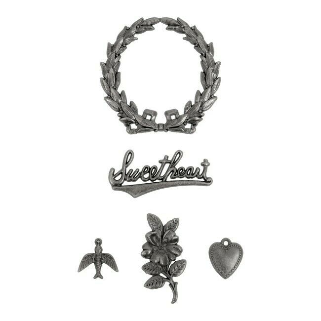 Luotpa sitten sekamediataidetta, kortteja tai koruja, Tim Holtz Sweetheart Adornmentsin monimutkaiset yksityiskohdat tekevät täydellisen viimeistelyn. Sydän - halkaisijaltaan 2,5cm, Lintu 2,5cm halkaisija, Kukka, Sweetheart, Seppele 5cm halkaisijaltaan. Valmistettu metallista.