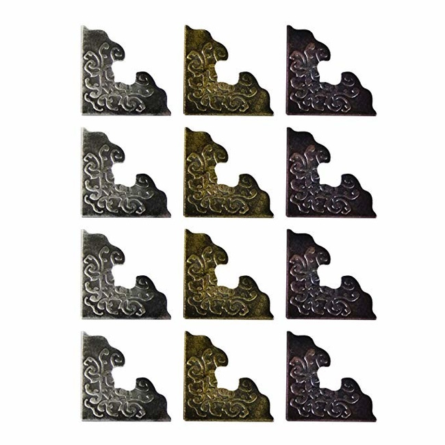 Kulmat: metallinen koriste, joka voidaan sijoittaa taulun kulmiin tai taittaa kiinni sivuun tai valokuvaan. Nämä metalliset kulmat ovat saaneet inspiraationsa vanhojen matkatavaroiden vahvikkeista. Kohokuvioidut yksityiskohdat ja antiikkiviimeistelyt täydentävät varmasti monia käsityöprojektejasi. Käytä niitä eri projekteissasi, kuten kankaassa ja laatikoissa, tai kiinnitä ne sivuihin tai kirjojen kansiin yksinkertaisesti kääntämällä kielekkeet taaksepäin. Saat 12 kulmaa (4 jokaisesta antiikkipinnasta - nikkeli, messinki ja kupari). Jokainen kulma on noin 2,5 cm korkea.
