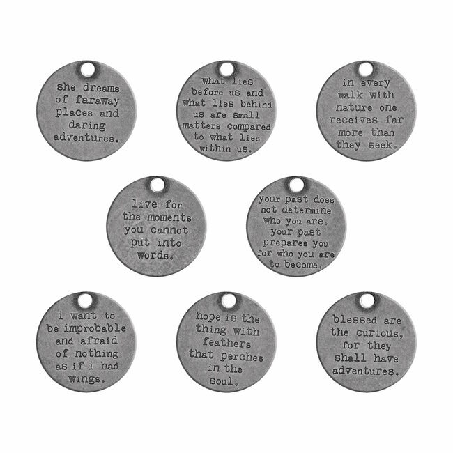 Kokoelma metalliriipuksia, joissa on mietelauseita. 8 kpl, antiikki nikkeli viimeistely. Koko noin 3 cm.