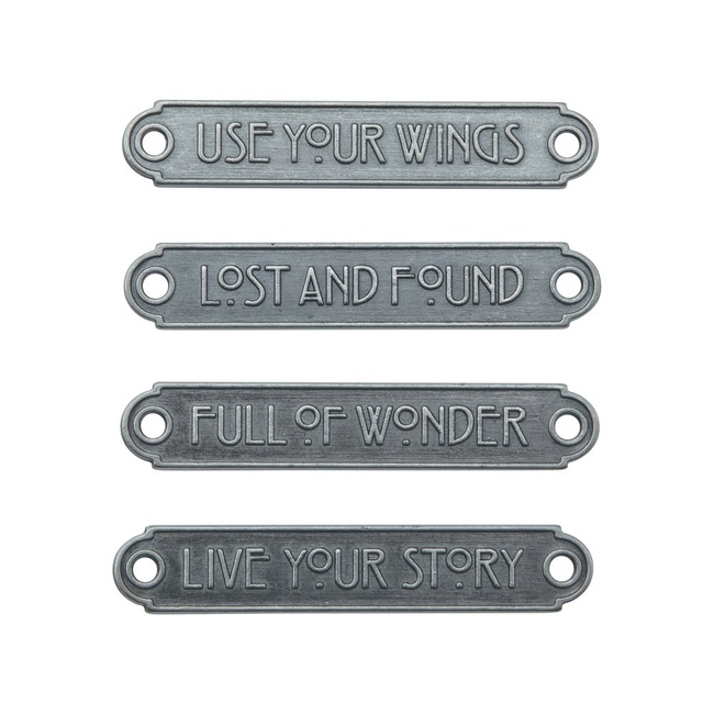 Tim Holtz Word Plaques ovat metallietikettejä, joissa jokaisessa on ainutlaatuiset korotetut sanat. Liimaa tai käytä Tim Holtz -kiinnittimiä saadaksesi ilmeikkään koristeen seuraavaan projektiisi. Sanataulut ovat noin 6 cm pitkiä. Valmistettu metallista.