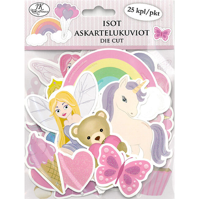 Isot askartelukuviot askarteluun ja koristeluun. Pakkaus sisältää 25 kappaletta erilaisia kartonkisia askartelukuvioita, joissa on glitteriä.
