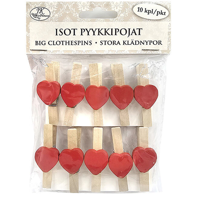 Pyykkipojat askarteluun ja koristeluun. Pakkaus sisältää 10 kappaletta puisia pyykkipoikia, joissa on koristesydän.