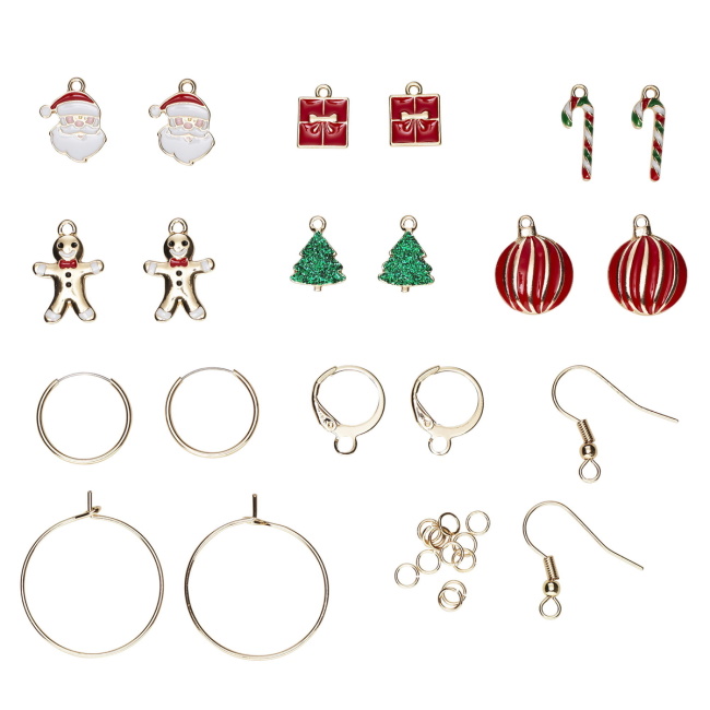 Joulukorvissetistä teet kauniita korvakoruja, joissa on jouluisia yksityiskohtia kultaisena, punaisena ja vihreänä! Sarja sisältää 4 paria korviskoukkuja ja 12 kaunista riipusta/korua tonttuina, joululahjoina, joulupalloina, karkkikeppeinä, piparkakkuukkoina jne. Mittausesimerkki: piparkakut ja karkkikepit ovat noin 15 mm pitkiä. Kreolikorvakorut ovat halkaisijaltaan 25 mm. Mukana myös välirenkaat.