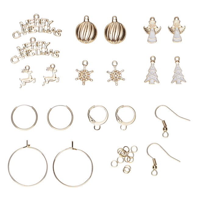 Joulukorvissetistä teet kauniita korvakoruja, joissa on jouluisia yksityiskohtia kultaisena ja valkoisena! Sarja sisältää 4 paria korviskoukkuja ja 12 kaunista riipusta/korua poron, enkelien, lumihiutaleiden, joulupallojen, "merry christmas" jne. Mittausesimerkki: joulukuuset ovat 18 mm pitkiä ja "merry christmas" on 30 mm leveä. Kreolikorvakorut ovat halkaisijaltaan 25 mm. Mukana myös välirenkaat.