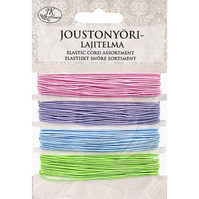 Joustonyörilajitelma koruaskarteluun ja muuhun askarteluun. Pakkaus sisältää neljä eri väristä joustonyöriä, jonka paksuus on 1mm. Nyörin materiaali on kumi/polyesteri.