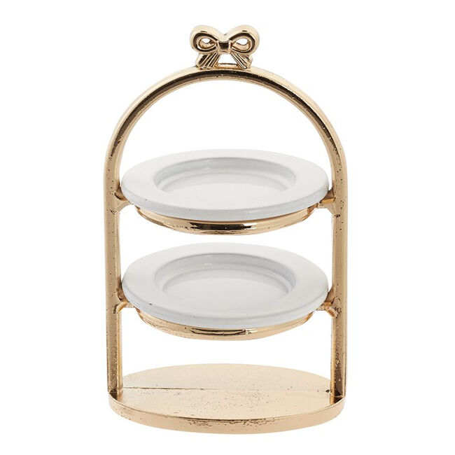 Miniatyyri kakkuteline, kulta/valkoinen. Koko 3 x 5 cm.