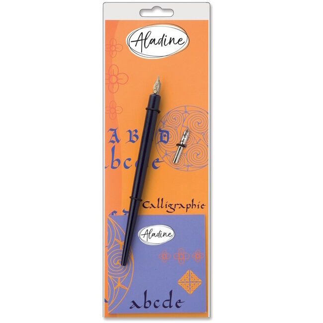 Kalligrafiasetti jossa kynä, 2 kärkeä ja pieni harjoitusvihkonen.