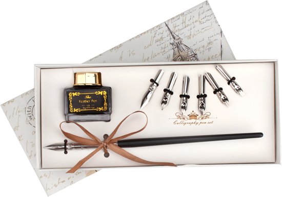 Setti sisältää kynän, 7 erilaista kärkeä ja mustepullon.