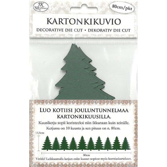 Kartonkikuviot askarteluun ja koristeluun. Aseta kuusiketju koristeeksi seinälle tai ikkunaan luomaan joulun tunnelmaa. Halutessasi voi myös leikata ketjusta yksittäisiä kuusia askarteluun ja koristeluun. Pakkaus sisältää yhden kartonkisen kuusiketjun, jossa on kymmenen kuusta.