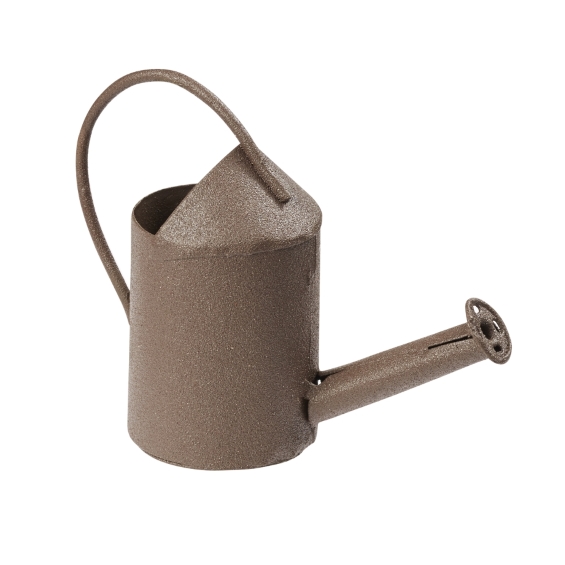 Metallinen ruskea kastelukannu. Koko 5,2 x 2,4 cm.