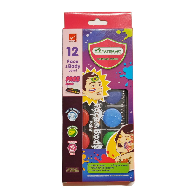 MasterArt kasvomaalisetti sisältää 12 kirkasta väriä. Värit: musta, ruskea, sininen, vaaleansininen, vaaleanvihreä, vihreä, violetti, pinkki, punainen, oranssi, keltainen ja valkoinen.