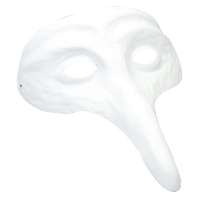 Valkoinen naamiopohja koristeltavaksi. Voit maalata naamion akryylimaaleilla, suihkeilla, viimeistellä kevyellä muovailusavella erikoisrakenteita tai tehosteita varten ja koristella höyhenillä, kristalleilla, kivillä, paljeteilla, pomponeilla, nauhoilla ja muilla koristeellisilla elementeillä.