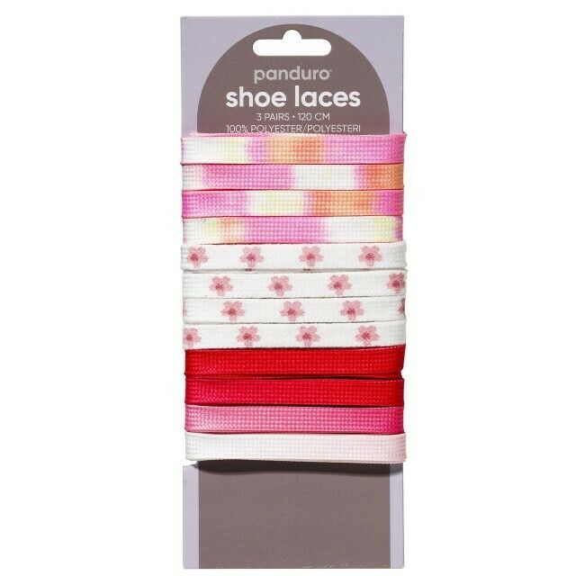 Kengännauhat – punainen, pinkki ja kukkainen! Lyhyesti sanottuna 3 paria kengännauhoja ihanalla väriteemalla, jotka koristavat varmasti kaikenlaisia nauhakenkiä. Pari 1 on valkoinen, vaaleanpunainen ja punainen, pari 2 on valkoinen, jossa on vaaleanpunaisia kukkia ja pari 3 vaeltelee valkoisen, vaaleanpunaisen, korallin ja oranssin pehmeiden sävyjen välissä. Pituus 120 cm, valmistusmateriaali 100 % polyesteriä.