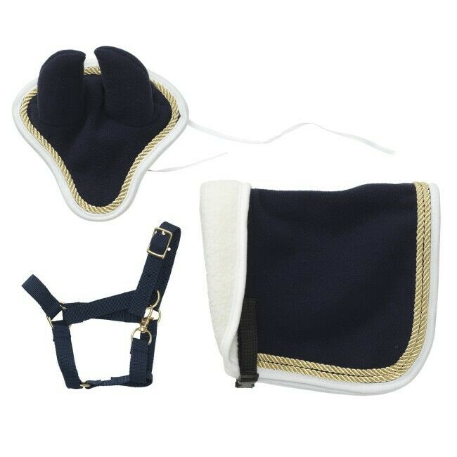 Korvahuppu ja loimi ovat kauniin kuninkaallisen tumman violetin sävyisiä, ja niissä on tyylikäs kierretty kultareunus, ja ne on vuorattu valkoisella ja lämmittävällä fleecellä. Pehmeää, tyylikästä ja eleganttia! Loimi kiinnitetään hihnalla alta ja hupussa on valkoinen satiininauha, joka on sidottu kuonon alle. Riimu on valmistettu hieman kovemmasta materiaalista, mutta on tietysti ylellisen violetti ja varustettu kullanvärisillä metalliheloilla.