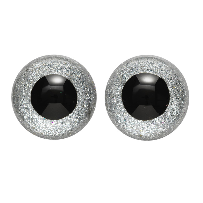 Suuret lasisilmät, jotka sopivat moneen tarkoitukseen. Silmissä on litteä tausta. Asioihin, jotka ovat liikkeessä tai joita käytetään vähän intensiivisemmin, suosittelemme huolellista liimaamista. Silmät ovat halkaisijaltaan 3 cm ja syvyys 1,5 cm. 2 kpl. Silmät mustilla pupilleilla ja "silmänvalkuaisilla" kimaltelevaa hopeaa.
