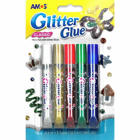 Kiilleliimakynät askarteluun ja koristeluun. Pakkauksessa viisi eri väristä kiilleliimakynää: hopea, kulta, punainen, vihreä ja sininen.