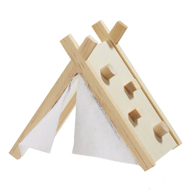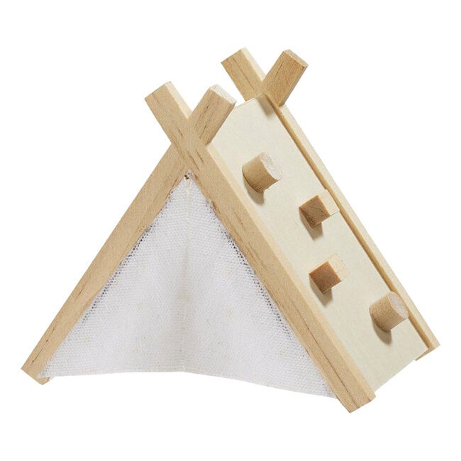 Koristeellinen puinen teltta, jossa on minikokoinen kiipeilyteline, näyttää realistiselta ja sopii mainiosti minipuutarhojen tai nukkekotien koristeeksi.