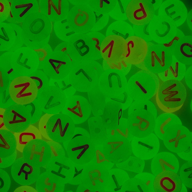 Noin 130 kpl pimeässä hohtavia pyöreitä kirjehelmiä. Yhdistä muiden helmien kanssa saadaksesi jänniä tehosteita, kun tietyt rannekorun tai kaulakorun osat alkavat näkyä pimeässä. Helmien halkaisija on 7 mm, paksuus 3 mm ja reiän halkaisija noin 1 mm. Sisältää kirjaimet A-Z.