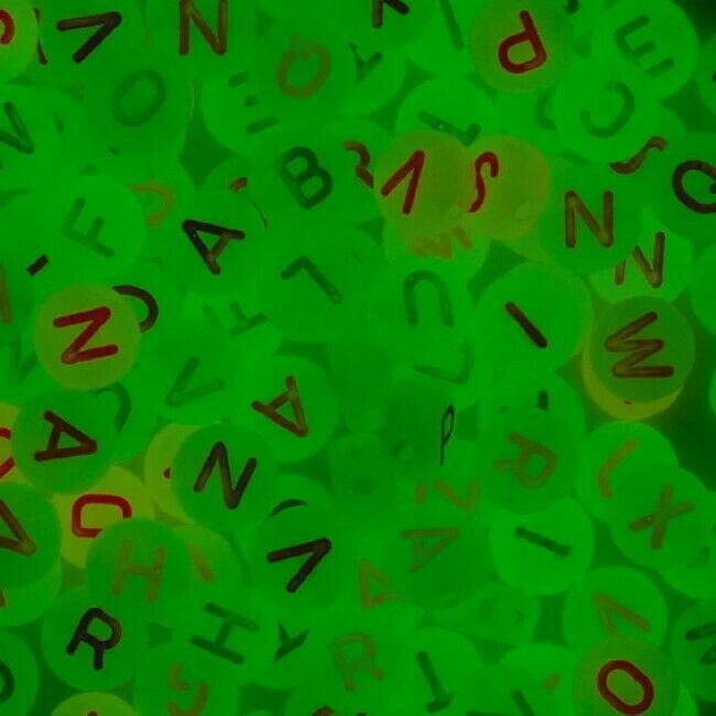 Noin 500 kpl pimeässä hohtavia pyöreitä kirjehelmiä. Yhdistä muiden helmien kanssa saadaksesi jänniä tehosteita, kun tietyt rannekorun tai kaulakorun osat alkavat näkyä pimeässä. Helmien halkaisija on 7 mm, paksuus 3 mm ja reiän halkaisija noin 1 mm. Sisältää kirjaimet A-Z.