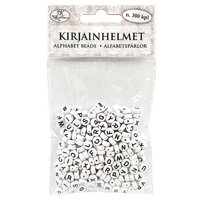 Kirjainhelmet koruaskarteluun. Pakkaus sisältää 40g eli noin 300 kappaletta muovisia kirjainhelmiä, joissa on mukana ääkköset Ä ja Ö. Kirjainhelmissä on painatus kahdella eri sivulla ja lajitelman sisältö vaihtelee pakkauksittain.