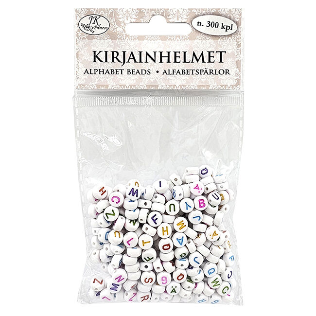 Kirjainhelmet koruaskarteluun. Pakkaus sisältää 40g eli noin 300 kappaletta muovisia kirjainhelmiä, joissa on mukana ääkköset Ä ja Ö. Kirjainhelmissä on painatus kahdella eri sivulla ja lajitelman sisältö vaihtelee pakkauksittain.