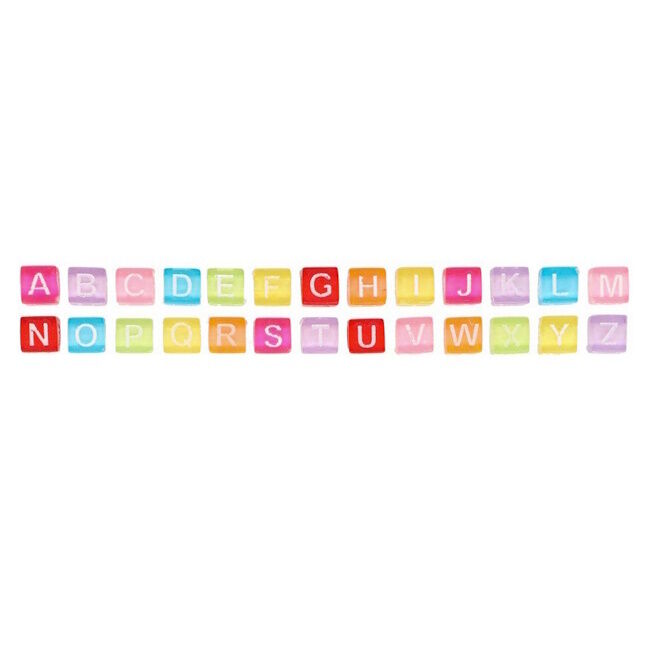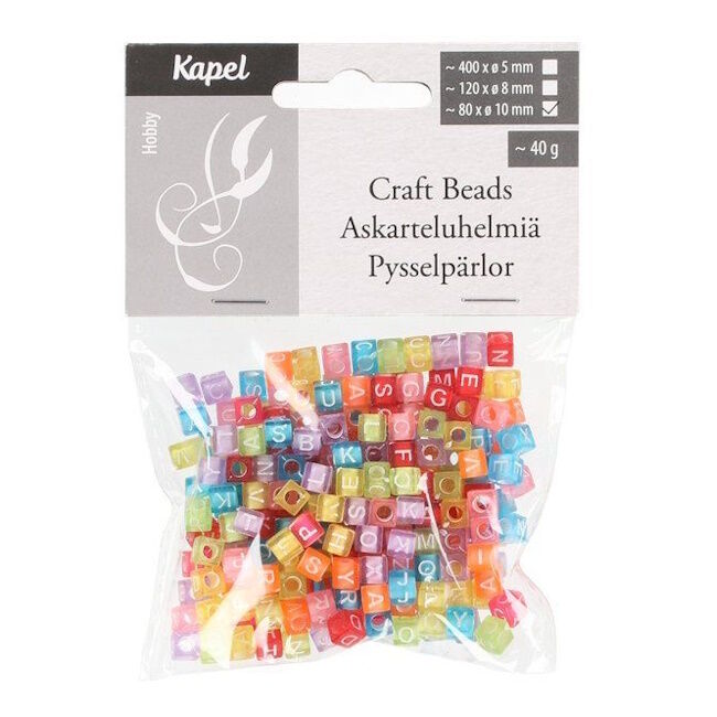 Läpikuultavat värikkäät kuution malliset helmet valkoisilla kirjaimilla. Helmien koko 6 x 6 mm. Pussissa noin 300 helmeä.